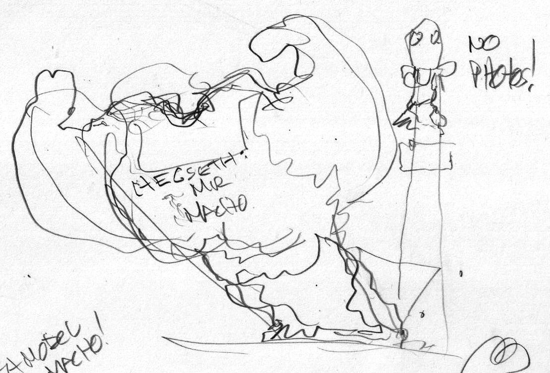 Secretary of Defense Peter Hegseth, a former Fox News host, is woefully under-qualified for his post. To make up for his inadequacies, he hides behind a veneer of bombastic, toxic masculinity. The more he struts and sneers the less impressive he seems… and he struts and sneers non-stop.